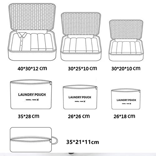 - 【Luggage packing Cubes Included】:7x Organiser bags - Large mesh bag: 40*30*12CM;Medium packing cube bag: 30*28*13CM;Small luggage bag: 30*21*13CM; Large flat pocket: 35*27CM;Medium laundry pouch: 27*25CM;Small flat pocket: 26*16CM