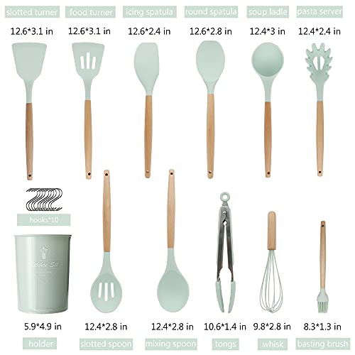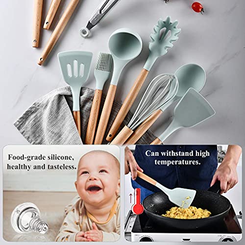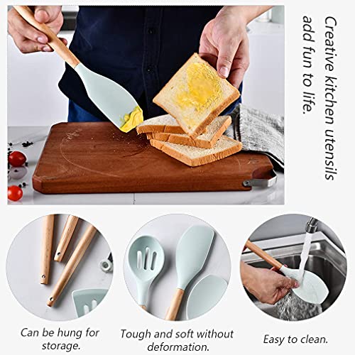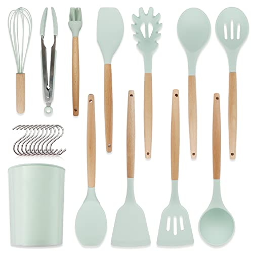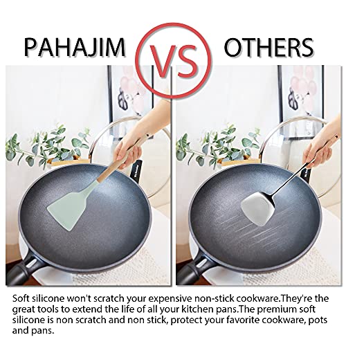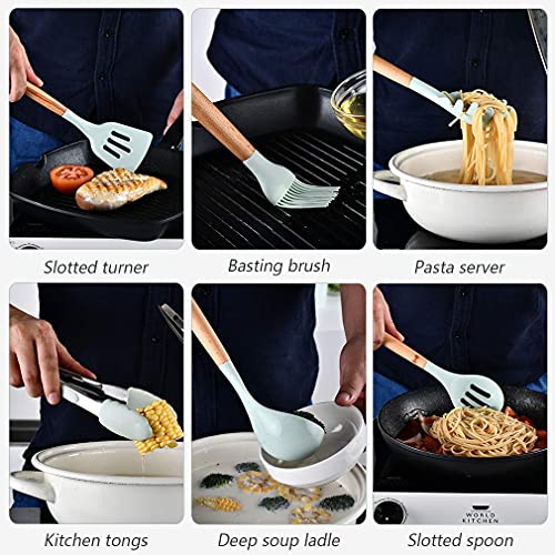 Pahajim - مجموعة ادوات مطبخ من الخشب والسيليكون من باهايم، معلقة تقديم المعكرونة، معلقة مخرمة لتقليب الطعام، معلقة بفتحات، فرشاة دهن، مساكة طعام، مغرفة شوربة عميقة، معلقة لتقليب الطعام، معالق صلبة (أخضر)