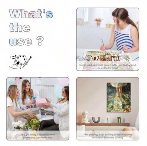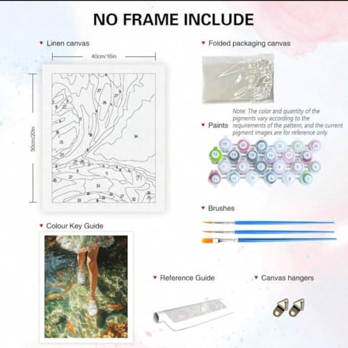 - مجموعة كاملة: تتضمن قماش كتان مقاس 40 × 50 سم، ودليل مرقم، وطلاء أكريليك، وفرش عالية الجودة، وإكسسوارات معلقة للبدء الفوري