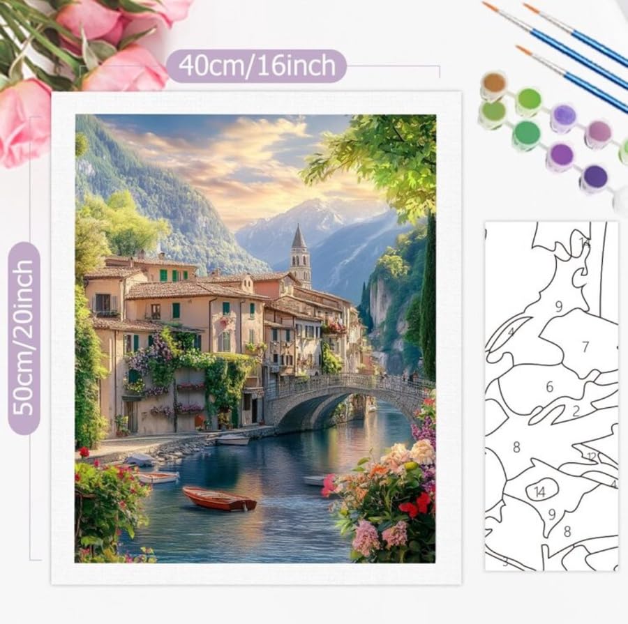 Generic - مجموعة الرسم بالارقام، مشهد جسر القرية الايطالية، قماش 40 × 50 سم، مجموعة فنية كاملة يمكنك صنعها بنفسك مع فرش وطلاء