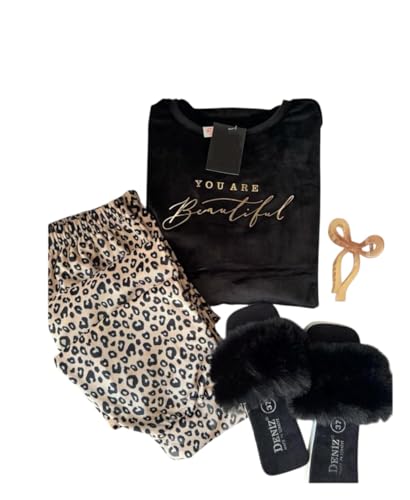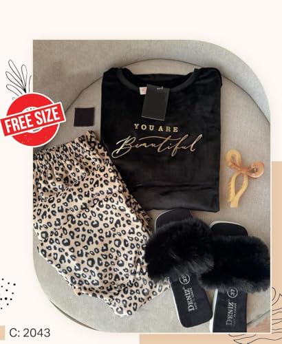 Generic - بجامة حريمي لون اسود وان سايز شتوي قطن ناعم – بيجامة بيت مريحة– ملابس نوم للسيدات تلبيس من 60 حتى 75 كيلو