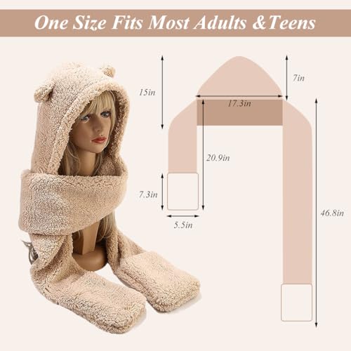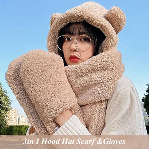 PALAY - PALAY® Bear Ear Winter Cap for Women,Cute Bear Hood Hat Winter Wear Scarf Hat for Ladies,Fashion Warm Women Accessories with Extended Long Scarf & Gloves, 3 In 1 Beige, other