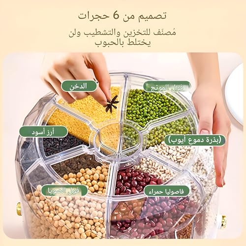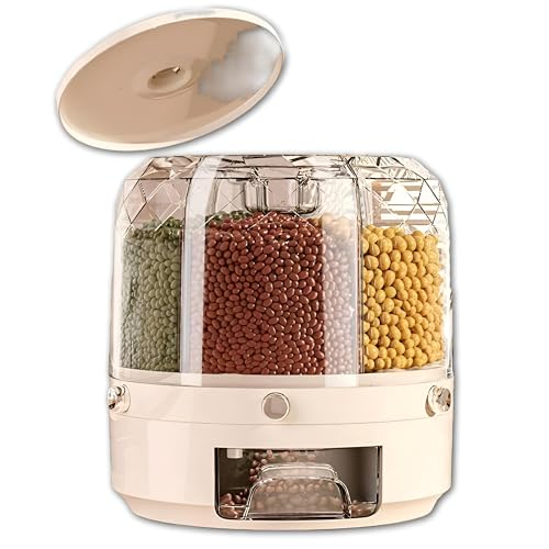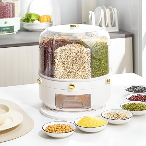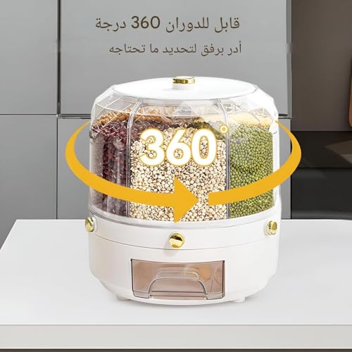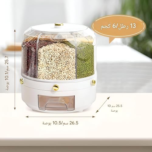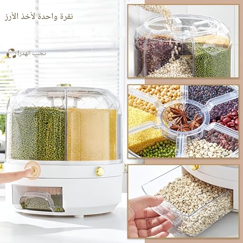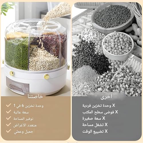 - 【Rice rice of 6 networks】 rotating 360 degrees, allowing you to put it at any angle to save the space and easily reach the food you need. Rice bucket of 6 networks is able to store up to 6 kg of rice, with each network with up to 1 kg. This large capacity design removes any concerns about the insufficient storage space.