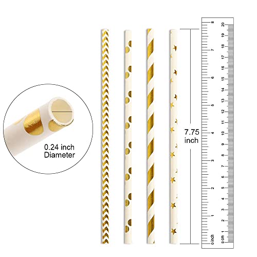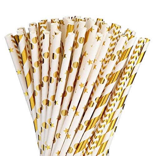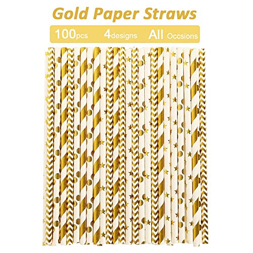 KASTWAVE - Paper straws for drinking, Biodegradable Gold Paper Straws Bulk, Pack of 100 Metallic Foil Striped/Wave/Heart/Star Straws for Birthday, Wedding, Bridal/Baby Shower, Celebrations and Party Supplies
