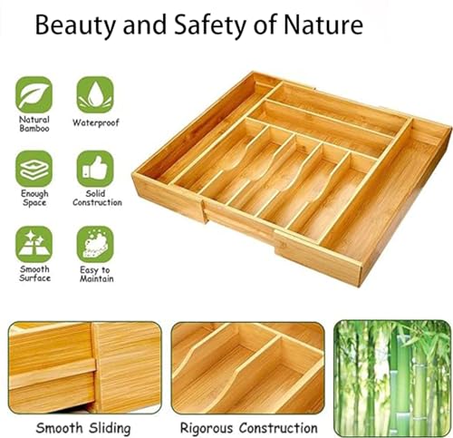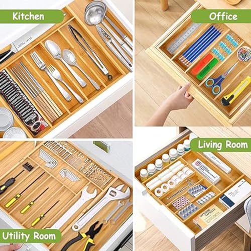 - ✅【Natural and Sustainable Bamboo】 This utensils organiser is made from natural bamboo, it is an renewable and sustainable resource that is sturdy, elegant, and durable to last for years. Food-safe finish on all surfaces. Bamboo drawer organizer is a great alternative to plastic.
