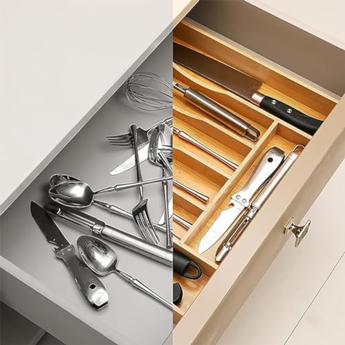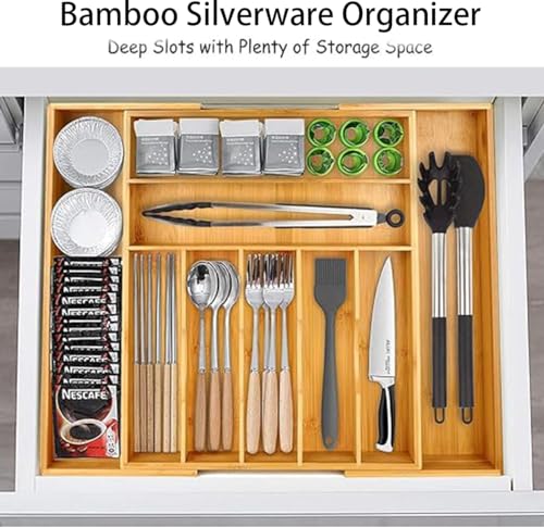 - ✅【Expandable and Adjustable Silverware Organizer】 Ourcutlery tray organizer is designed with 7-9 compartments, it can be expandable from 13.8 inches to 20 inches in width with smooth sliding, 17.5 inches in length. which are grooved drawer dividers in-between designed for maximum capacity and ultra convenience.