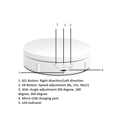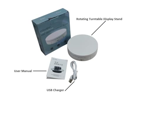 - Package Includes : 1 x Electric Rotate Display Stand, 1 x USB Charging Cable, 1 x User Manual, 1 x Mirror Decoration (for styling) and 1 x Battery.