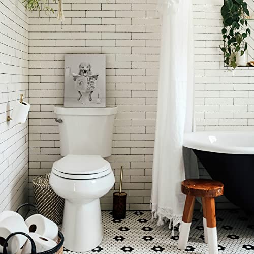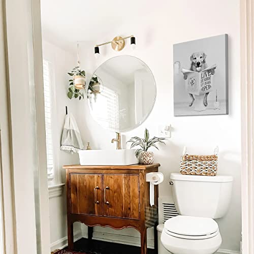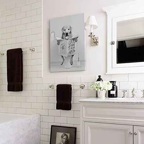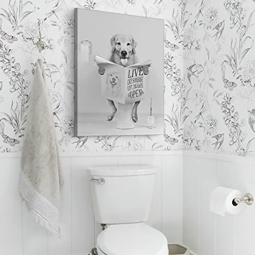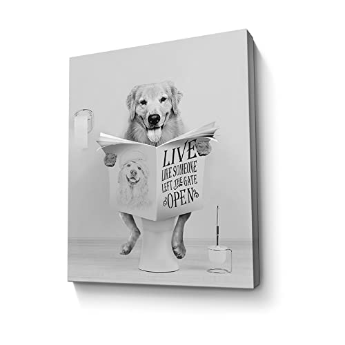 Parylore - لوحة فنية جدارية عصرية بتصميم كلب جولدن ريتريفر بلون ابيض واسود يجلس على المرحاض ويقرا الصحف مؤطرة لديكور الحمام والمرحاض مقاس 12×16 بوصة
