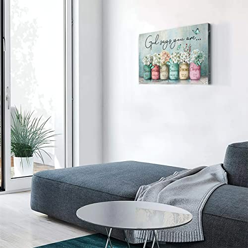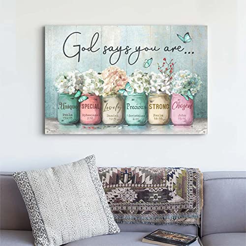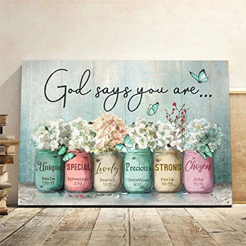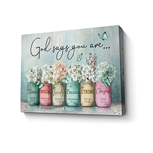 Parylore - Inspirational Canvas Wall Art Encouraging Bible Verses On Cute Marson Jars and Butterflies God Says You Are Teal Background Artwork for Living Room Bedroom Bathroom Office Home Decor 12x16 In