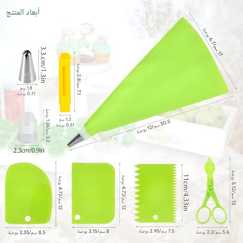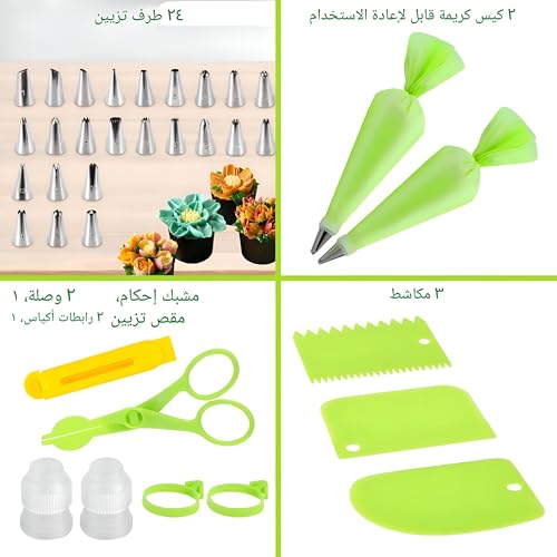 - تحتوي هذه المجموعة الشاملة على 35 قطعة، تتميز بـ 24 رأس أنبوب، و2 كيس معجنات قابل لإعادة الاستخدام مقاس 12 انش، و3 كاشطات، و2 وصلة، ومشبك إغلاق واحد، وربطتين للكيس، ومقص أنبوب، مما يجعلها حلاً شاملاً لكل من المبتدئين والمحترفين في تزيين الكيك.