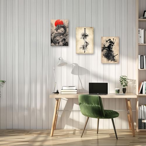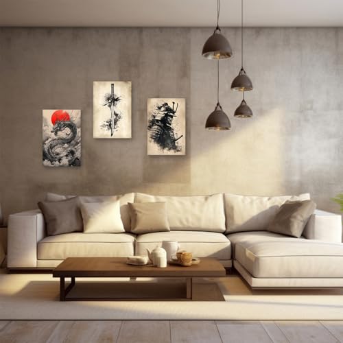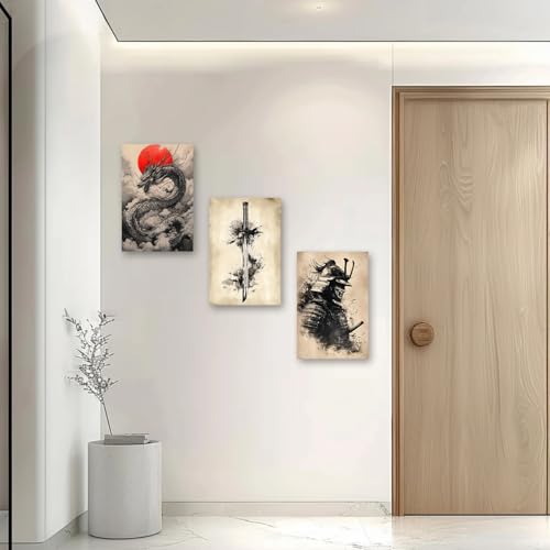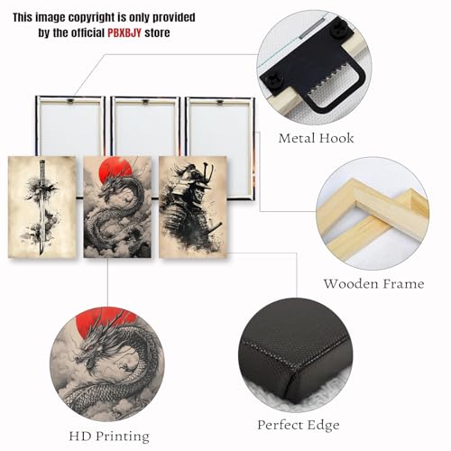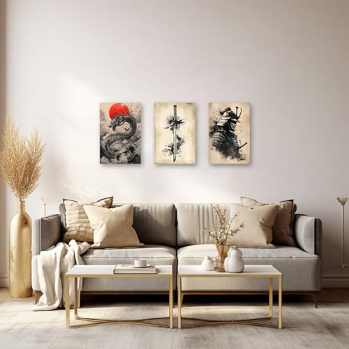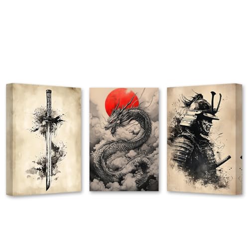 PBXBJY - PBXBJY Samurai Wall Art Japanese Canvas Painting 3 Pieces Samurai Katana with Dragon Pictures Bushido Poster Living Room Kids Room Decor Frame (16x24inchx3Pcs)