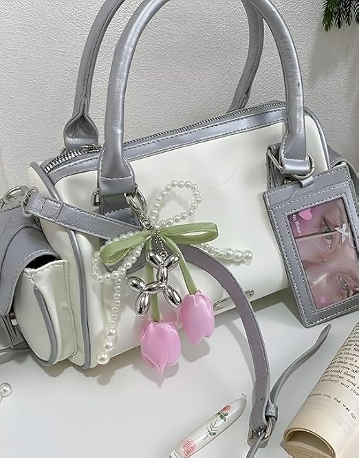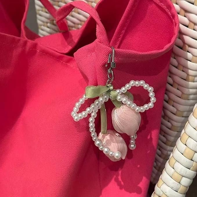 Generic - ميدالية مفاتيح بتصميم لؤلؤ وشريط ساتان أخضر، زينة حقيبة بألوان موف ، إكسسوار أنيق مع قلادة معدنية وزهور للسيدات