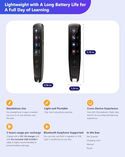 - مستقل بذاته ولاسلكي - إنه قلم قراءة متطور مع شاشة LCD تعمل باللمس. يمكنك استخدامه بشكل مستقل في أي مكان - في المكتبة أو في الفصل الدراسي أو في المكتب أو أثناء التنقل - عن طريق التحقق مباشرة من النتائج على الماسح الضوئي للقلم.