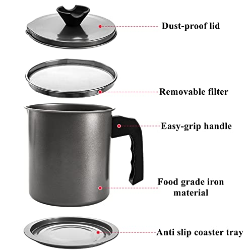 - Perfect Design: Our cooking oil can comes with a dust-proof lid, removable mesh strainer, which is fine enough to filter out old batter pieces from cooked items, coaster tray and easy-grip handle. These accessories can prevent oil from leaking onto the counter and separate bits and pieces from the oil thoroughly.