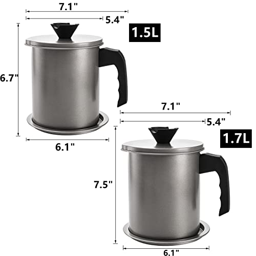 - Large Capacity: There are 2 different sizes of our oil strainer. The larger one is about 1.7L (1.8 Quart), measured in 5.39" D x 6.3" H. The smaller one is about 1.5L (1.6 Quart), measured in 5.39" D x 5.51" H. Enough for daily use.