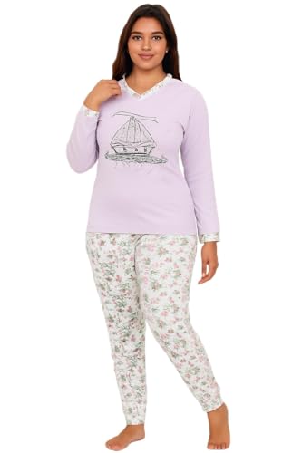 Perfect Fashion - طقم بيجامة موضة موديل pg5 مثالي بطباعة زهور، بلوزة بأكمام طويلة ورقبة على شكل حرف V مع تصميم قارب، بناطيل بطباعة زهور للنساء، لون أرجواني فاتح وأبيض