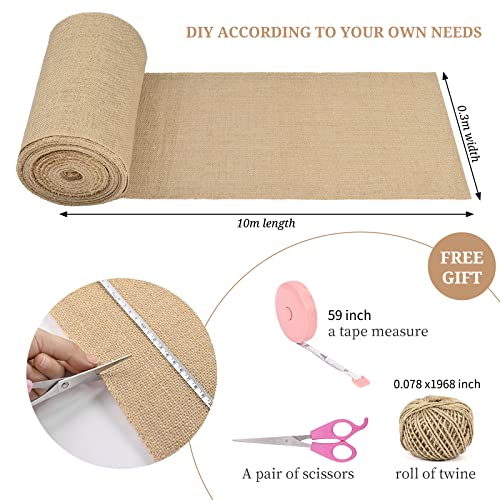 - The package includes: 1 roll 30 cm x 10 m hessian table runner, in addition, our set also includes hemp rope, measuring tape, scissors as a free gift. The extra long linen table runner can meet your daily and activity needs to the highest degree. You can DIY your family and children and enjoy the wonderful parent-child time that this linen table runner brings with you.