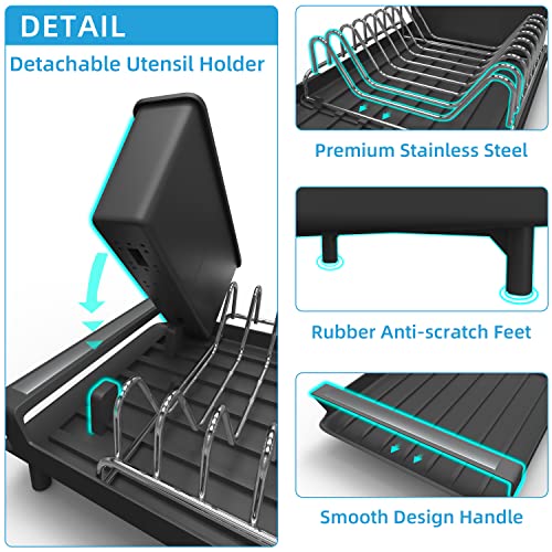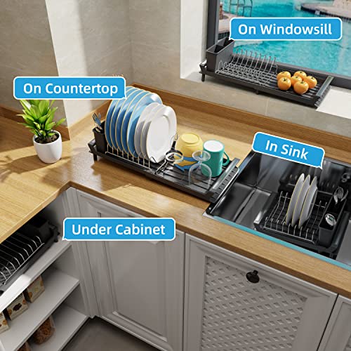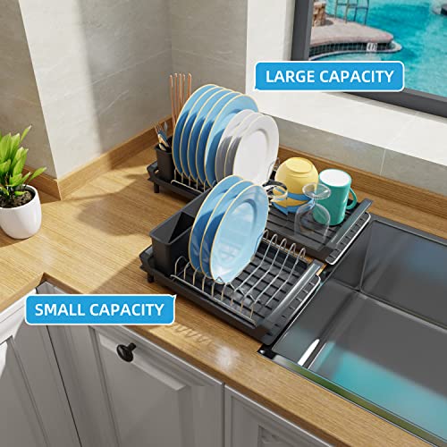 PETXPERT - رف تجفيف الأطباق من بيت اكسبيرت قابل للتوسيع لطاولة المطبخ مع حامل للأواني منظم مصفاة أطباق صغير الفولاذ المقاوم للصدأ لوح تصريف للمطبخ في الحوض أسود بلاستيك