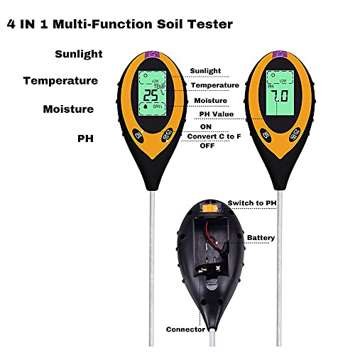 - [قياس سريع ودرجة حرارة التربة] تحدد درجة حرارة التربة بيئة نمو النباتات، وبناء دفيئة قياسية لنباتاتك. احصل على بيانات التربة في 3-5 ثوانٍ باستخدام مجموعة اختبار درجة الحموضة في التربة مقاس 4 في واحد. قبل الاختبار، يرجى مسح المسبار مقاس 10-12 سم بلطف وأي أكاسيد قد تكون قد تشكلت على السطح المعدني.