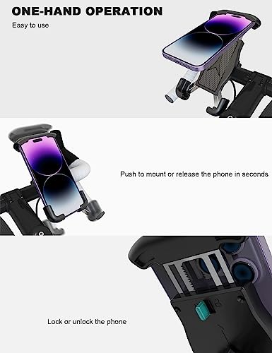 - Easy to Install: the one-hand operation handlebar phone mount is easy to install without tool. There is a button behind the bike phone holder for locking the phone firmly.