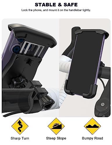 - Sturdy & Safe: the motorcycle phone holder grips each corner of your phone tightly, which ensures your cell phone attached to the bike handlebar safely even on a bumpy road.