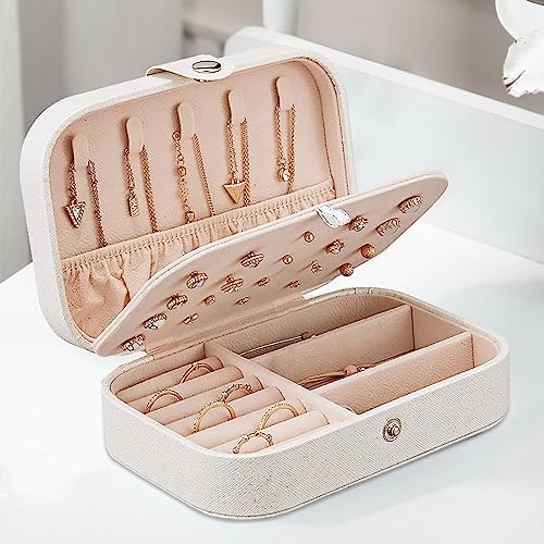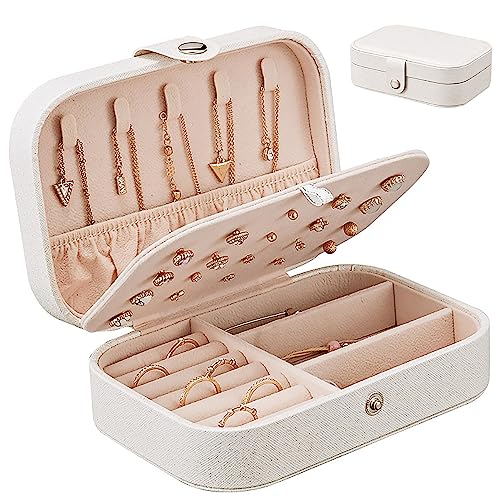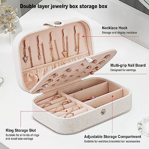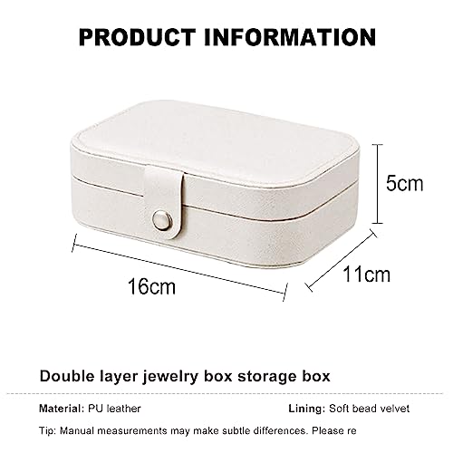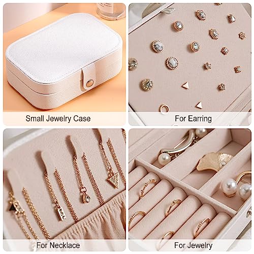 PICKBEAU - صندوق مجوهرات للسفر من بيكبو منظم جلدي صغير للنساء والفتيات حامل 3 طبقات مع خطافات تخزين محمول للاقراط والخواتم والقلائد - ابيض