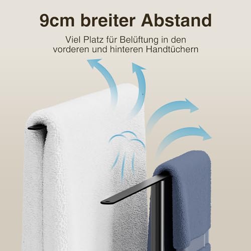 - 2. المقاس - تم تجهيز حامل المناشف بقضيبين للتعليق بارتفاعات مختلفة 85 سم و76 سم، بحيث يكون مناسبًا للمناشف ومناشف الحمام من أي حجم - سواء كانت كبيرة أو صغيرة.