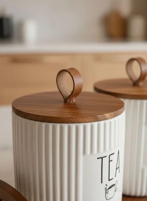 - ELEGANT DESIGN: Beautiful ribbed porcelain canister set with wooden lids adds a sophisticated touch to any kitchen countertop whilst keeping essentials organised.