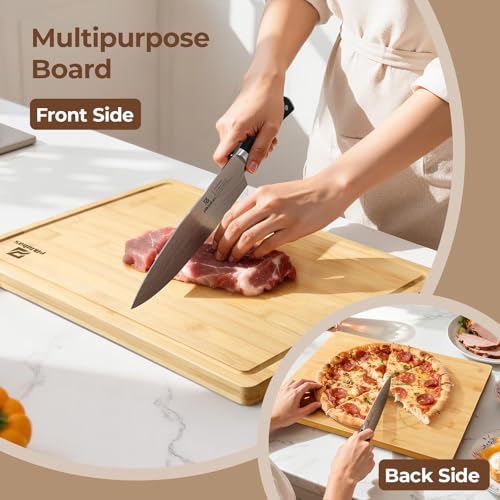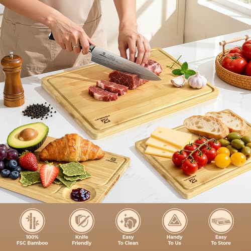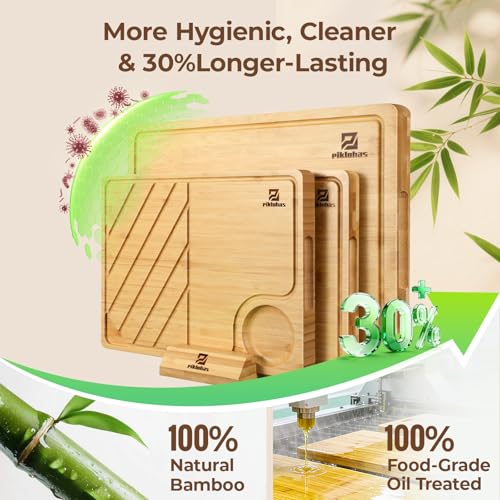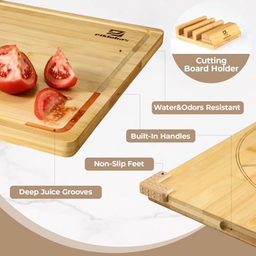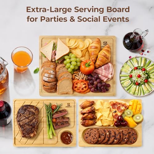 Piklohas - مجموعة الواح تقطيع كبيرة من الخيزران للمطبخ مكونة من 3 قطع، لوح تقطيع خشبي مع حامل مانع للانزلاق، صينية تقديم شرائح اللحم مع اخدود عصير، كتلة جزار كبيرة للجبن، مثالية كهدية