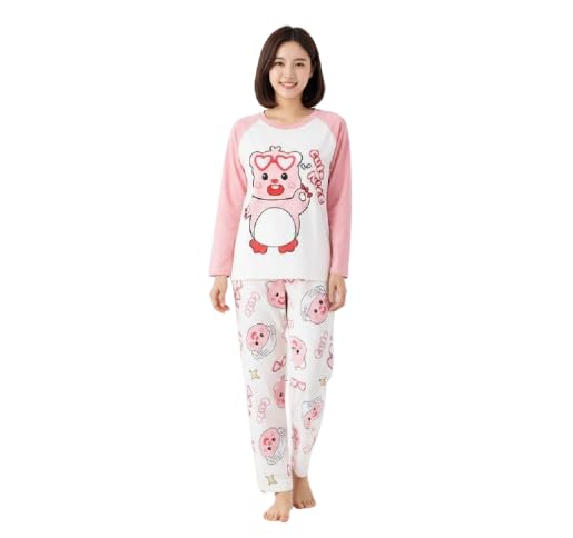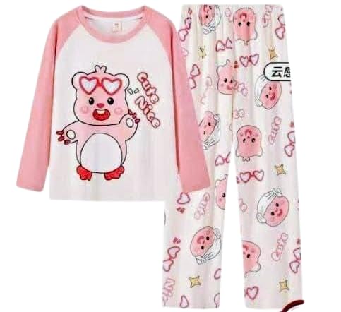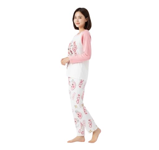 Generic - Pink and White Raglan Long Sleeve Comfy Cotton Pajama Set Cartoon Bear Heart Glasses Printed Loose Pants with Duplicate Characters and Stars