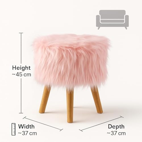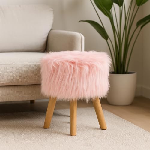 - CONTEMPORARY DESIGN: Pink faux fur stool with natural wood legs adds a stylish and modern touch to any room, featuring a round shape and beige-toned soft cushioned seat