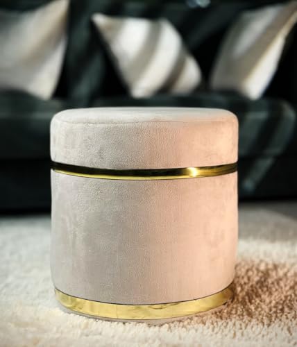 - تصميم أنيق وعصري: صندوق تخزين دائري مغطى بقماش مخملي ناعم باللون الوردي الفاتح مع حواف ذهبية فاخرة تضيف لمسة من الأناقة