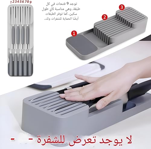 - يعتبر منظم السكاكين للأدراج حل تخزين متعدد الاستخدامات من مستويين يمكنه استيعاب السكاكين بأحجام مختلفة، ويحمل ما يصل إلى 9 سكاكين دون عناء. هذا التصميم الفريد مثالي للحفاظ على السكاكين الصغيرة والكبيرة منظمة بأناقة في مطبخك، مما يضمن أن كل سكين له مساحة خاصة به ويمكن الوصول إليه بسهولة عند الحاجة. يزيد الهيكل المكون من طبقتين من كفاءة التخزين ويمنع الفوضى ويسمح لك بتحسين مساحة الدرج مع الحفاظ على مساحة منظمة