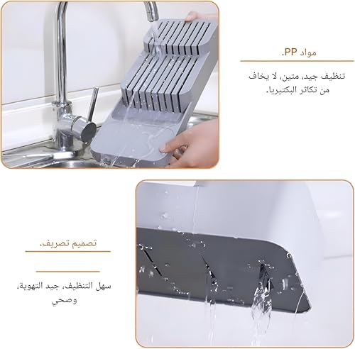 - بالإضافة إلى ذلك، يتميز المنظم بقاعدة غير قابلة للانزلاق تبقيه في مكانه بأمان داخل الدرج، مما يمنع أي انزلاق أو حركة غير مرغوب فيها أثناء فتح الدرج وإغلاقه. يعزز عنصر التصميم المدروس هذا سهولة الاستخدام ويضمن بقاء سكاكينك مخزنة بشكل آمن، مما يقلل من خطر الحوادث. ميزة مقاومة للانزلاق مفيدة في الحفاظ على درج مرتب ومنظم، حيث تساعد على منع الفوضى وتحافظ على وضع السكاكين المطلوب.