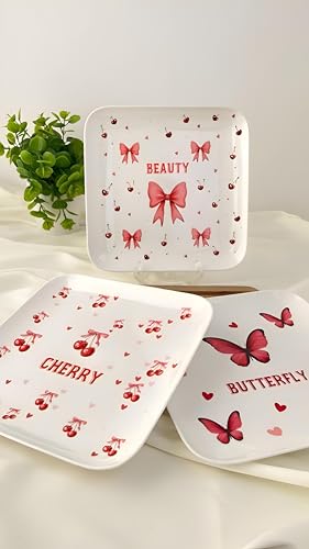 - Bring a splash of creativity to your kitchen with this charming three-piece plate set. Each item tells a story through its design: the refreshing Cherry, the romantic Beauty featuring delicate bows, and the whimsical Butterfly bringing nature indoors. These plates are engineered from tough, lightweight plastic that withstands daily wear and tear effortlessly. Perfect for everything from birthday parties to casual lunches, they offer a break-free solution that maintains its aesthetic appeal over