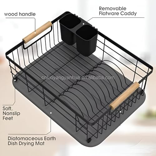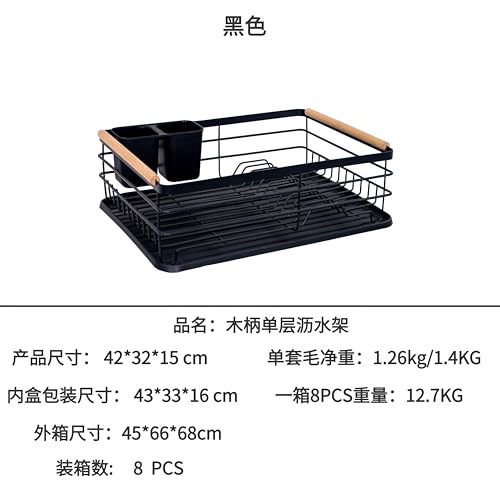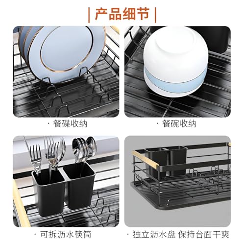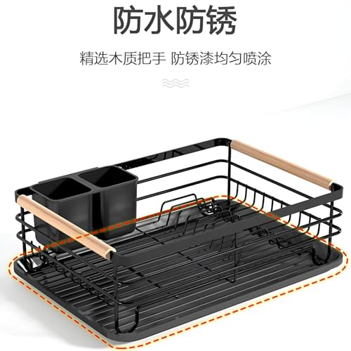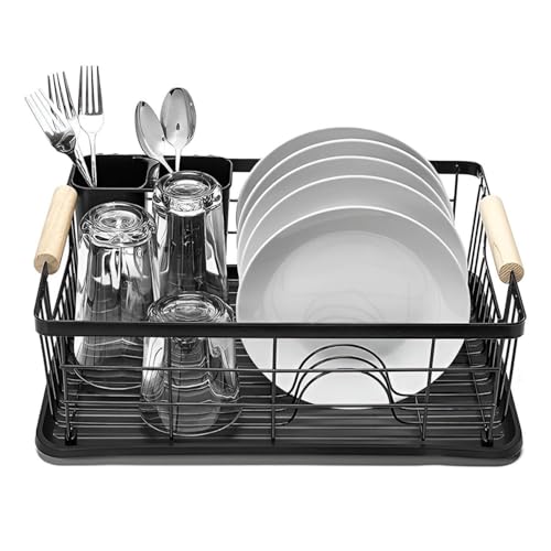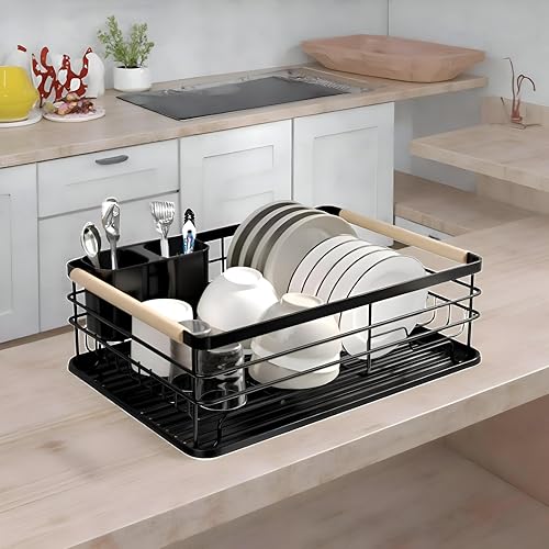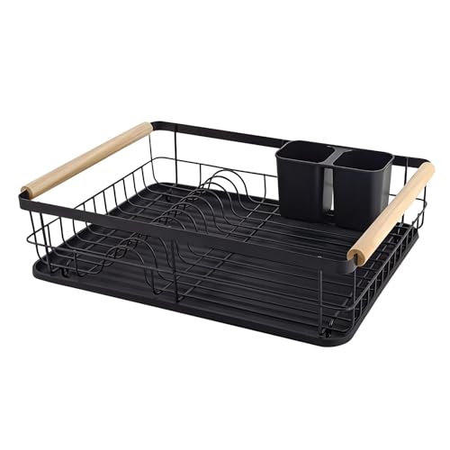 Generic - منظم أطباق، رف تجفيف معدني أسود أنيق معزز بمقبض متين من خشب الزان، مجهز بحامل أدوات مائدة عملي وصينية تصريف، للمطابخ العملية الحديثة