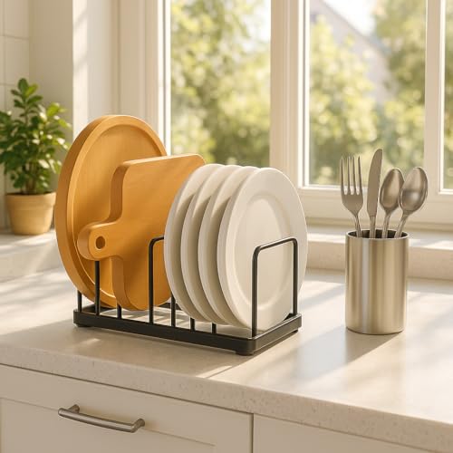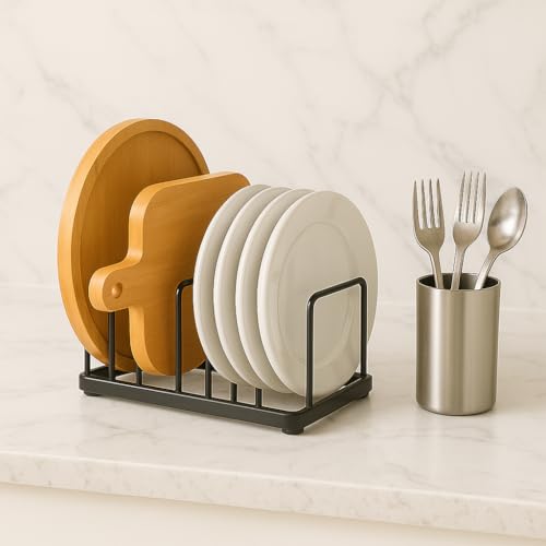 - Use in kitchen cabinets, pantry, or on kitchen counter to dry and store dish plates, pod lids, cutting boards, bakeware, serving trays, place mats, etc. Can also be used as a desktop organizer.