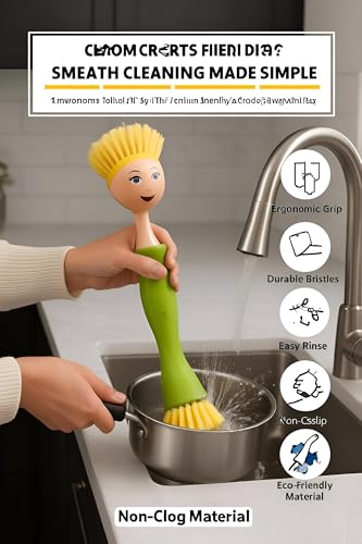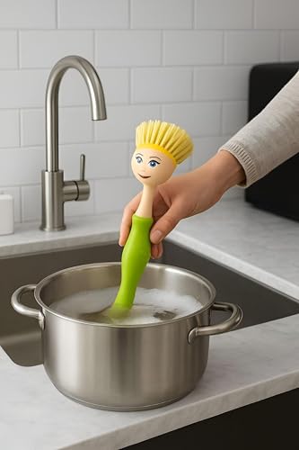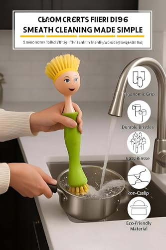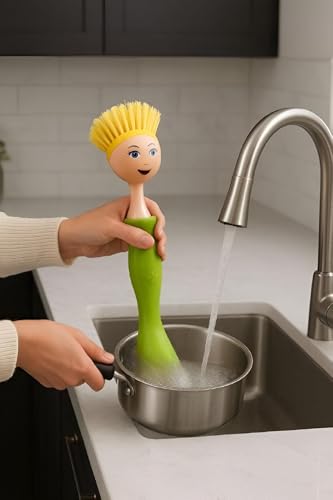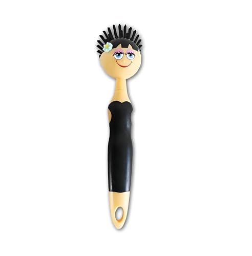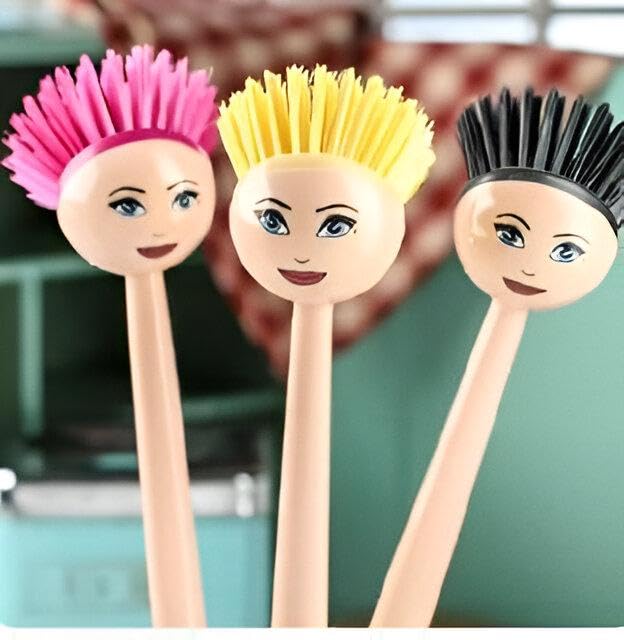 - This dishwashing brush stands out with its unique doll-inspired design, featuring a cheerful face and bright bristles that look like colorful hair, making kitchen chores both practical and visually delightful.