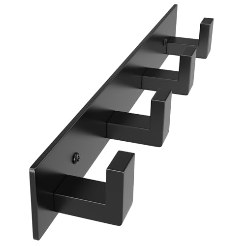 PMMASTO - حامل بالطو يثبت على الحائط مع خطافات تعليق سوداء شديدة التحمل على شكل حرف L من الفولاذ المقاوم للصدأ للمناشف، شماعات حائط للبالطو والروب للحمام والمطبخ والمدخل، أسود 4 خطافات، قطعة واحدة