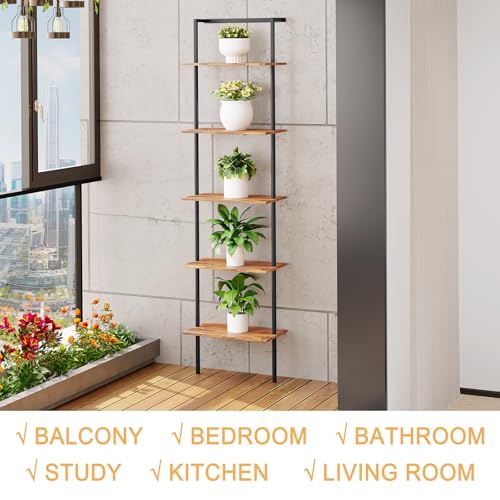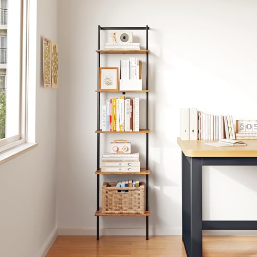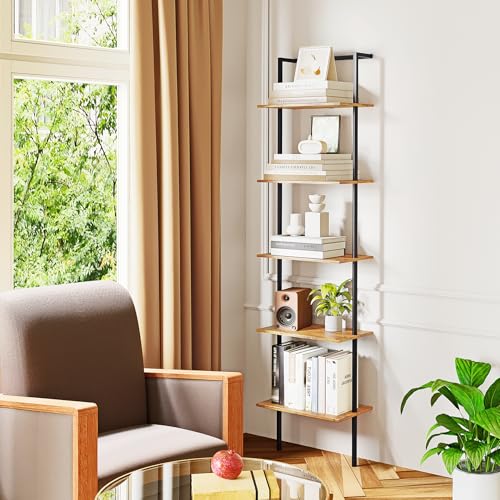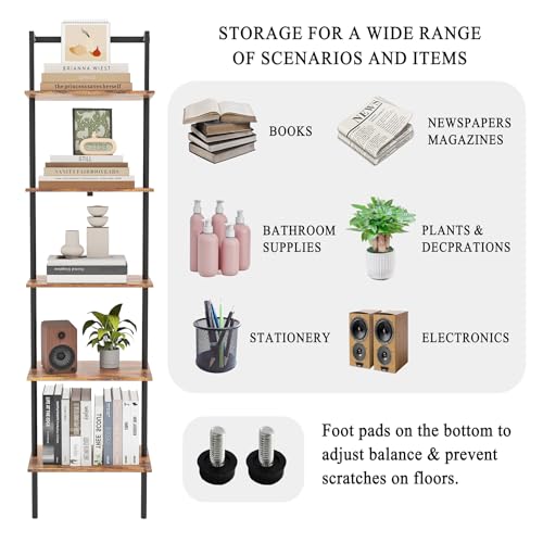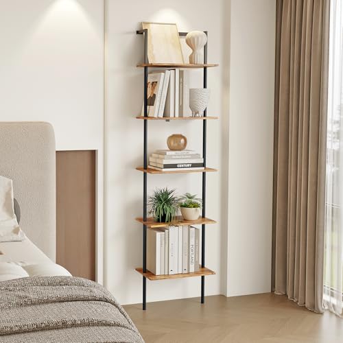 POBOMULI - 5-Tier Ladder Shelf, Wall Mounted Ladder Bookshelf with Metal Frame, Wood Tall Open Storage Rack and Display Shelves for Home Office Bedroom Living Room, Rustic Brown