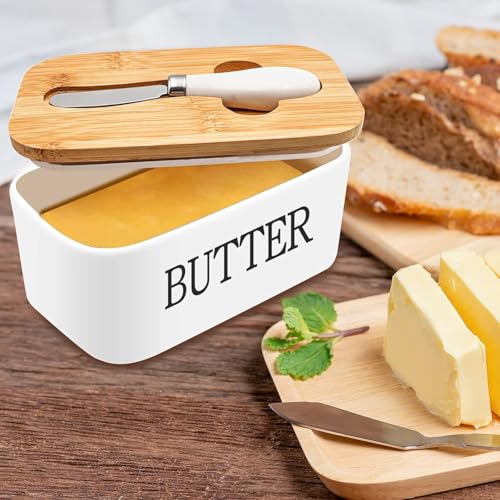Generic - حافظة زبدة بورسلين مع غطاء خشب بامبو وسكينة استانلس لتخزين الزبدة طازجة وآمنة للميكروويف وغسالة الأطباق والفريزر تصميم عصري متين وعالي الجودة