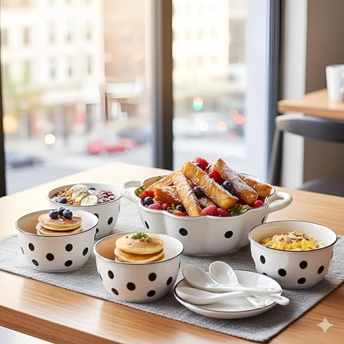 Generic - طقم اوعية طعام بورسلين - 5 اطباق انيقة لتوفير متعة انيقة ومريحة لكل وجبة، مجموعة من 5 قطع تتضمن 4 اعمدة و1 بول كبير و4 ملاعق