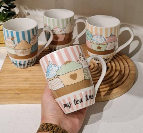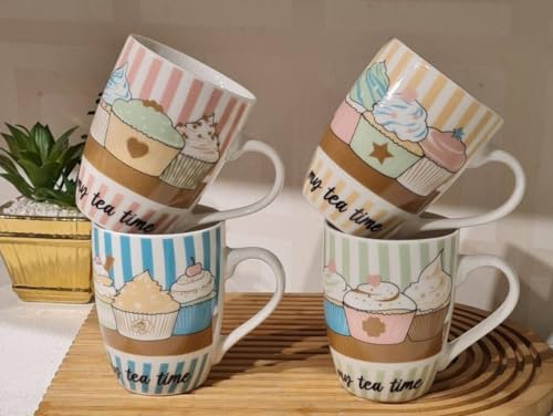 Generic - Porcelain Tea Cup Set of 4, Striped Cupcake Design, with Handle