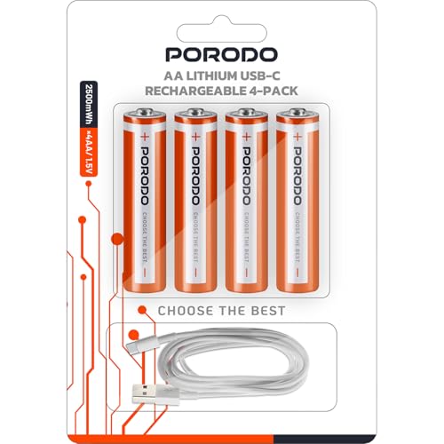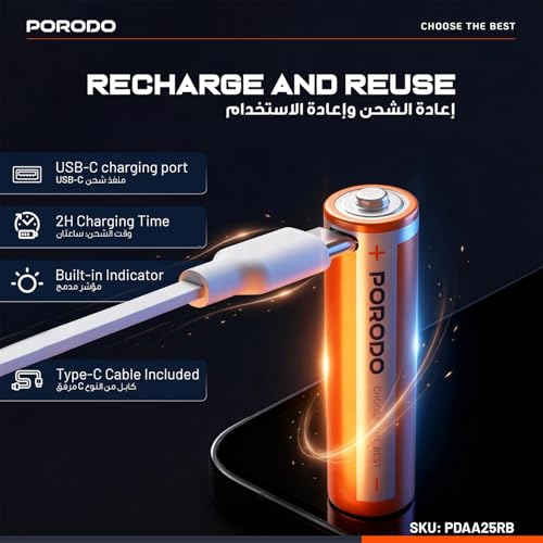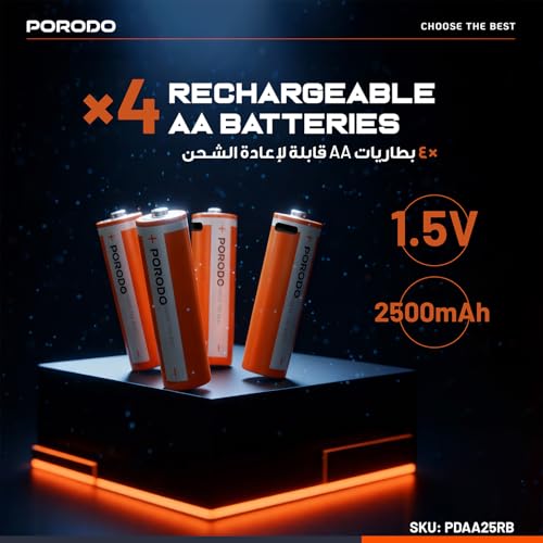Porodo - Porodo Rechargeable AA Batteries, Universal Double AA, Pack of 4, 2500mWh Capacity, USB Type‐C Charging Port (White/Orange)