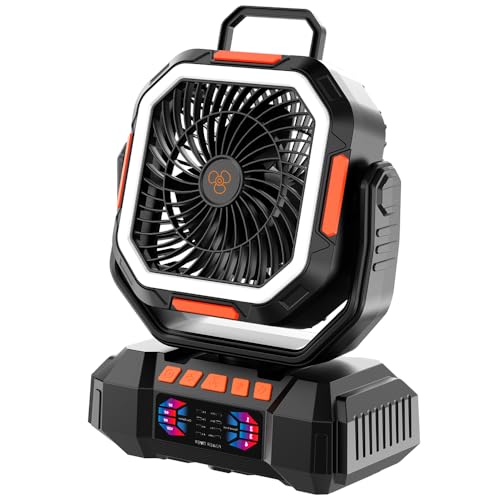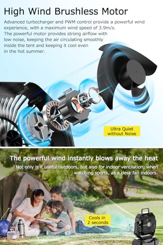 - Strong Wind & Low Noise: This camping fan has built-in powerful dual motors and double-layer fan blades, offers 4 adjustable wind speeds, which can adjust the wind volume from light breeze to strong gusts, bringing a personalized comfort experience, so that you can stay cool at home or when traveling such as camping. The brushless motor and upgraded fan blades operate efficiently with minimum noise, and you will have a calm.