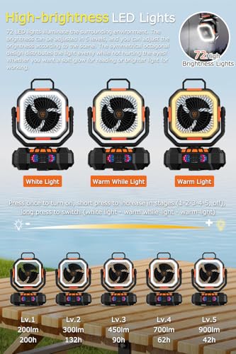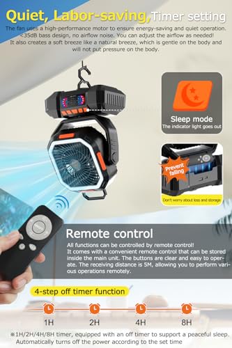 - High bright Light & Timer: This portable fan is equipped with 3-speed high-brightness LED lights, a total of 72 high-quality LED lamp beads, and provides three adjustable color temperatures (white light/warm white light/warm light), soft and non-glaring light. Built-in smart timer function, you can set the fan to automatically shut off after 1, 2, 4 or 8 hours. It can be used as lighting for outdoor camping,and provide emergency lighting during power outages.