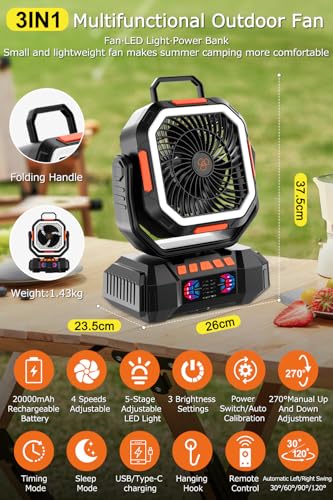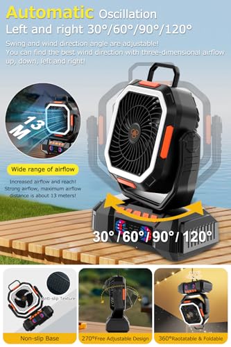 - Auto Oscillation and 270-Degree Rotation: This sleeping travel fan has an automatic shaking head function, providing four angles of 30°, 60°, 90°, and 120°. The fan head can also be adjusted up and down from 0° to 270°. Evenly distribute the cool air and provide a full range of cooling experience.A 360° rota-table and fold-able hook at the bottom for hanging the tent fan anywhere you want to.