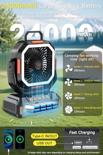 - 24000 mAh Rechargeable Battery: This portable fan rechargeable with an internal 24000mAh high-capacity battery for excellent performance and durability, and can be recharged using a Type-C data cable. It also comes with USB-A and USB-C dual charging ports, allowing you to seamlessly charge smartphones, tablets, and other USB devices on the go. Perfect for camping, fishing, barbecue, picnic, etc.