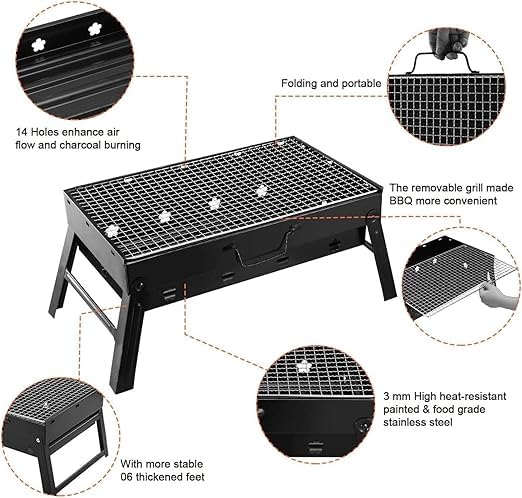 Generic - شواية فحم محمولة الي اي مكان ، مزودة بشبكة شواء قابلة للإزالة لسهولة التنظيف، تحتوي على 14 فتحة تهوية لتعزيز تدفق الهواء واحتراق الفحم بكفاءة