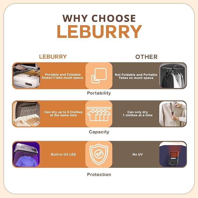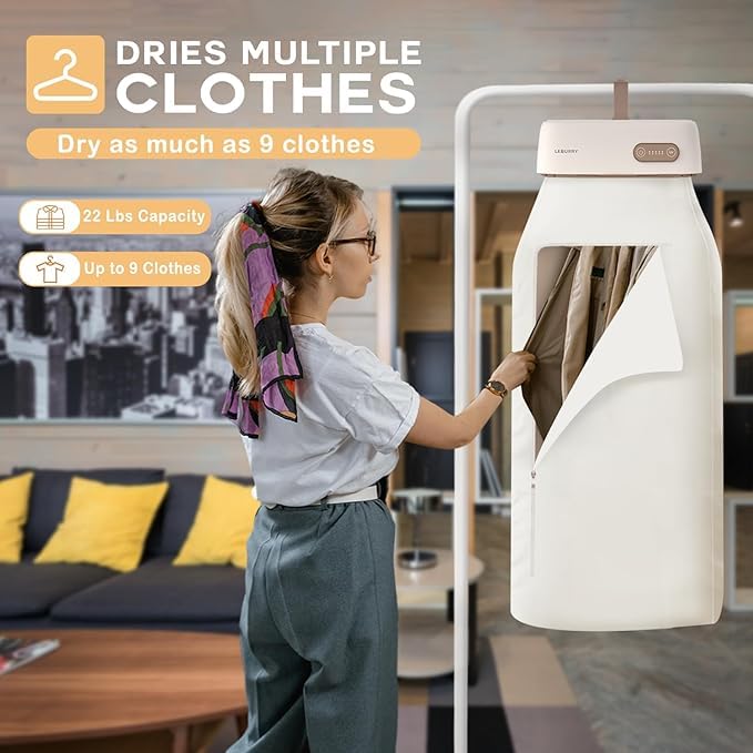- Portable Clothes Dryer: The Leburry clothes dryer is designed for efficient and effortless clothes drying, accommodating up to 9 clothes at once. It comes with a dryer bag that enhances drying efficiency by retaining hot air, ensuring swift drying times. Installation is simple: securely attach the dryer bag, hang the machine on a stable rod, and set the drying time. This portable dryer is ideal for adult and baby clothes, underwear, plush toys, and various fabrics.